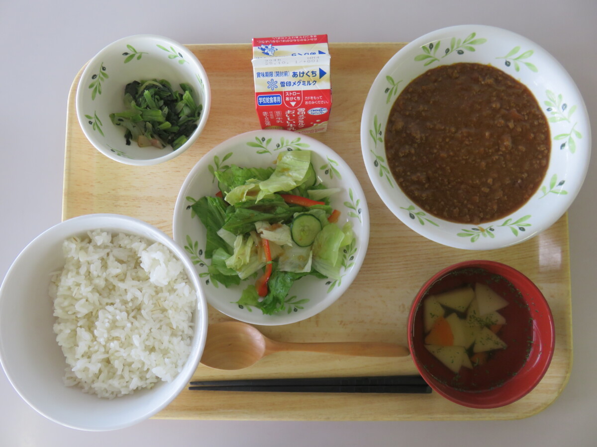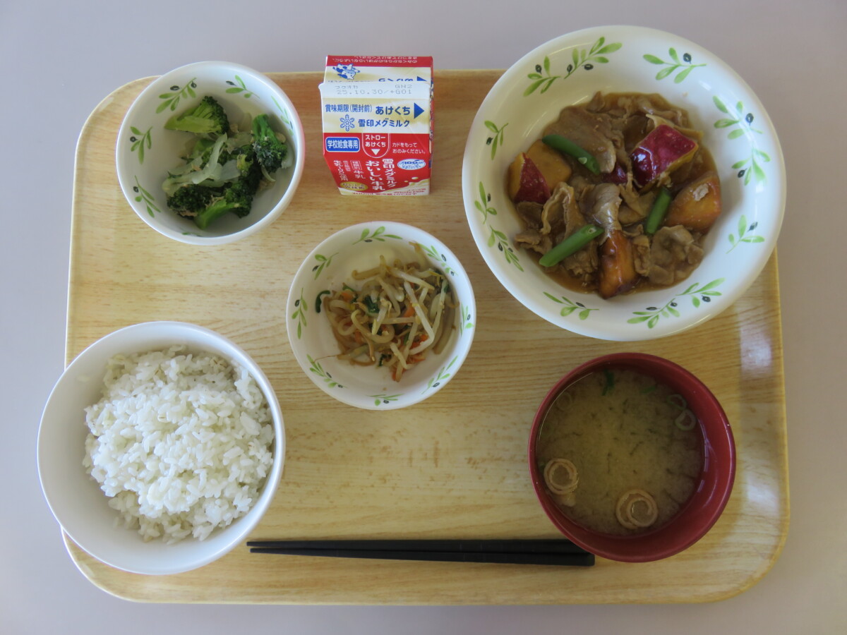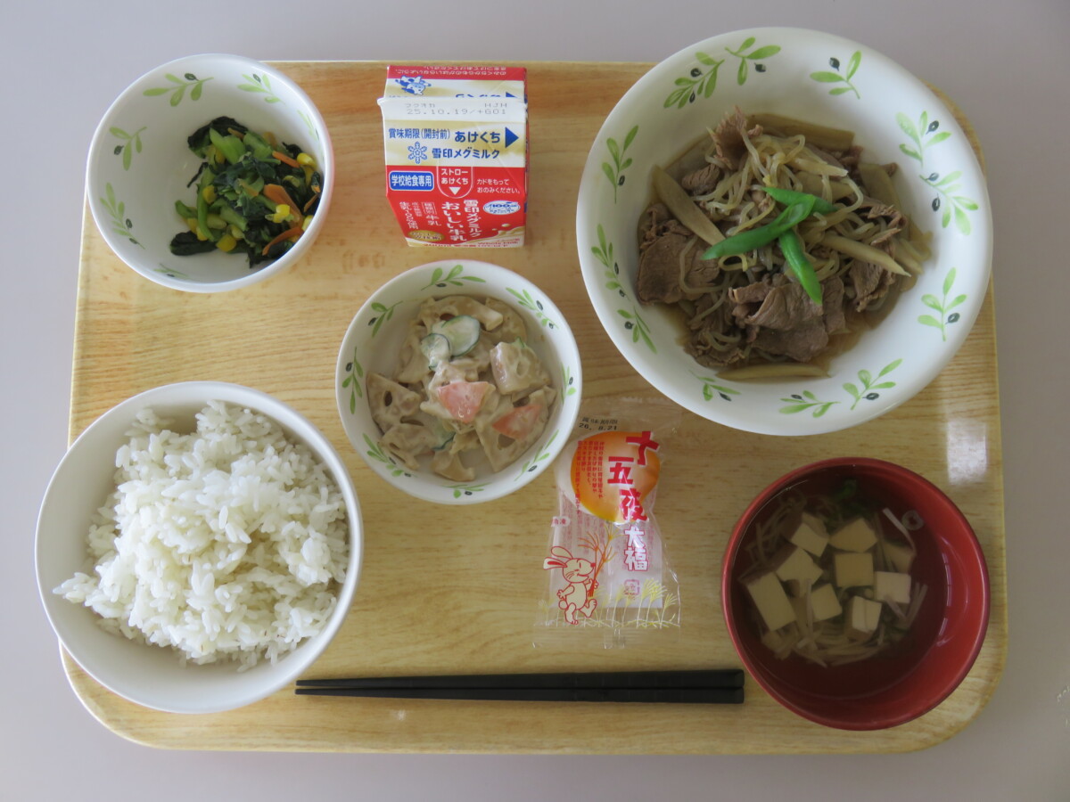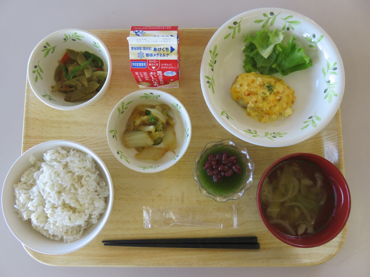 伝統的な和食の基本形「一汁三菜(ご飯・汁物・主菜・副菜・副々菜)給食」を実施しています。発育期の男子に必要な栄養をバランスよく摂取でき、丈夫な体を作ります。また、食べることの意味やマナー、団らんの大切さについて学びます。
